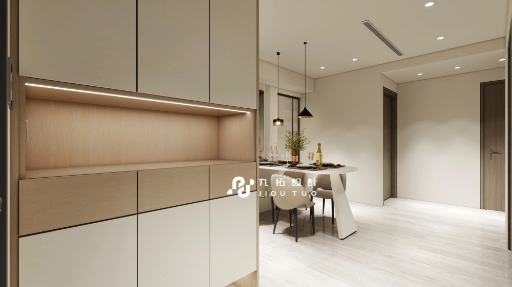 回到家,映入眼簾的是木質溫度與純白門板的玄關櫃,搭配暖光燈條,入口處成為釋放